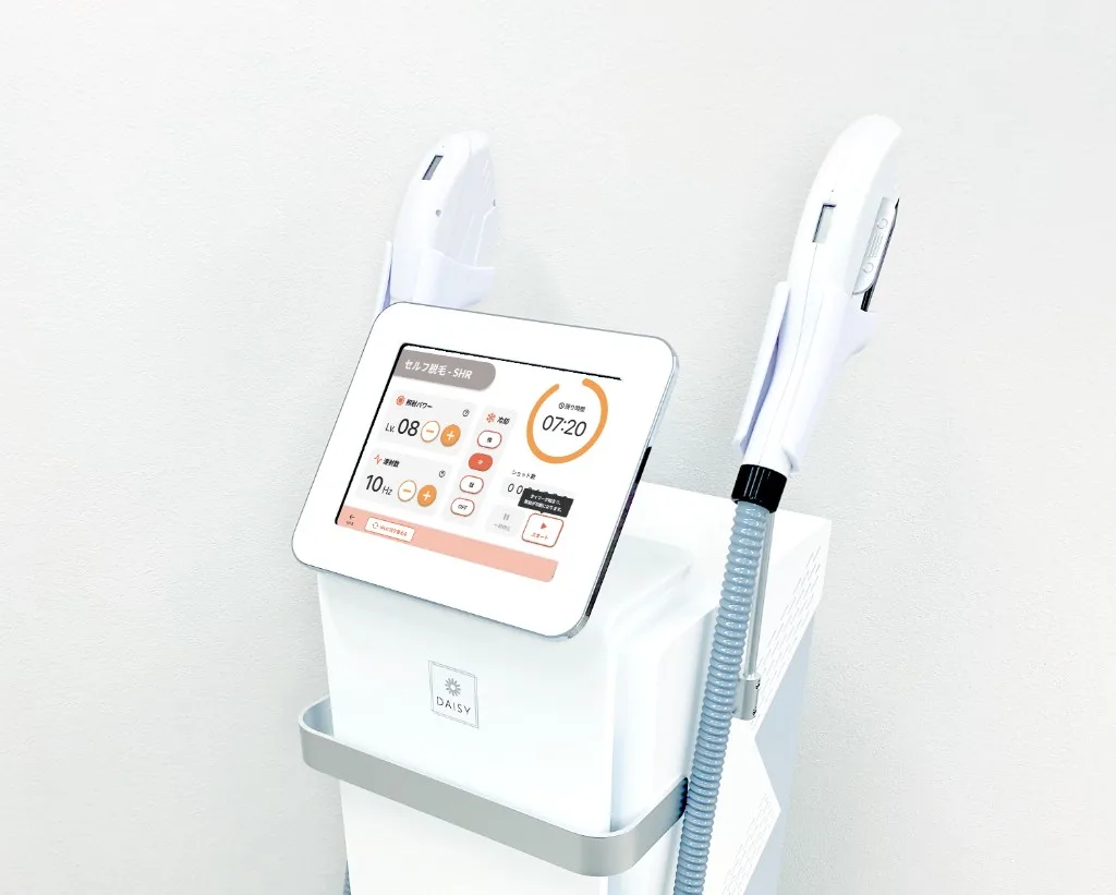 国産メーカー製の業務用ハイブリッド脱毛機DAISY。大型タッチパネルでIPL/SHRを切り替え、冷却しながら照射できるプロ仕様です。